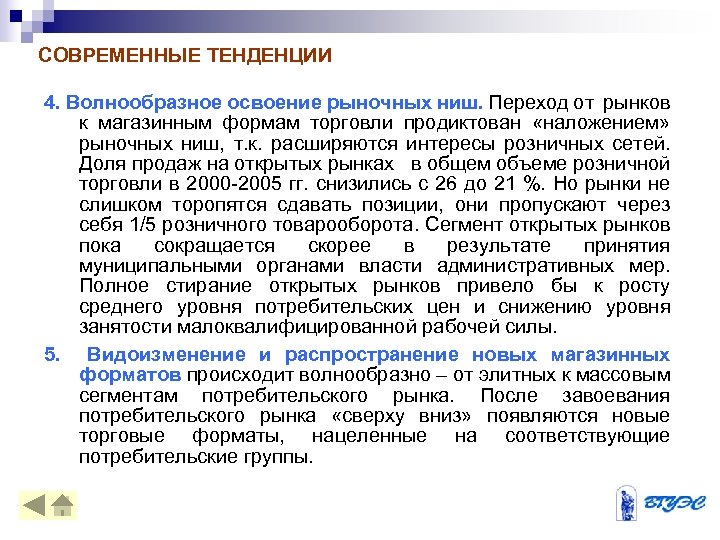 СОВРЕМЕННЫЕ ТЕНДЕНЦИИ 4. Волнообразное освоение рыночных ниш. Переход от рынков к магазинным формам торговли продиктован «наложением» рыночных ниш, т. к. расширяются интересы розничных сетей. Доля продаж на открытых рынках в общем объеме розничной торговли в 2000 -2005 гг. снизились с 26 до 21 %. Но рынки не слишком торопятся сдавать позиции, они пропускают через себя 1/5 розничного товарооборота. Сегмент открытых рынков пока сокращается скорее в результате принятия муниципальными органами власти административных мер. Полное стирание открытых рынков привело бы к росту среднего уровня потребительских цен и снижению уровня занятости малоквалифицированной рабочей силы. 5. Видоизменение и распространение новых магазинных форматов происходит волнообразно – от элитных к массовым сегментам потребительского рынка. После завоевания потребительского рынка «сверху вниз» появляются новые торговые форматы, нацеленные на соответствующие потребительские группы.