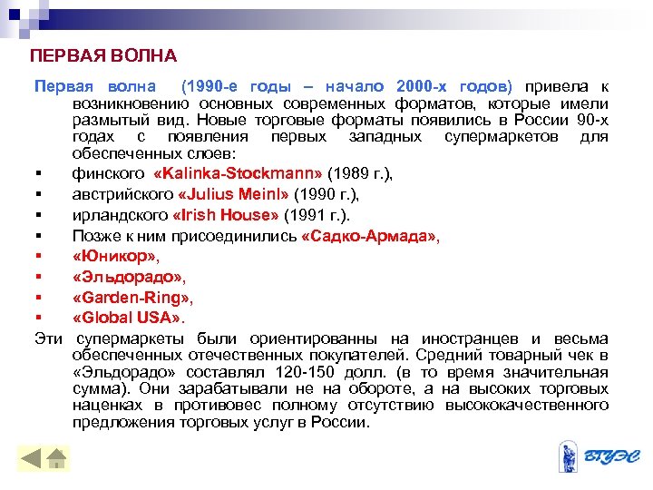 ПЕРВАЯ ВОЛНА Первая волна (1990 -е годы – начало 2000 -х годов) привела к возникновению основных современных форматов, которые имели размытый вид. Новые торговые форматы появились в России 90 -х годах с появления первых западных супермаркетов для обеспеченных слоев: § финского «Kalinka-Stockmann» (1989 г. ), § австрийского «Julius Meinl» (1990 г. ), § ирландского «Irish House» (1991 г. ). § Позже к ним присоединились «Садко-Армада» , § «Юникор» , § «Эльдорадо» , § «Garden-Ring» , § «Global USA» . Эти супермаркеты были ориентированны на иностранцев и весьма обеспеченных отечественных покупателей. Средний товарный чек в «Эльдорадо» составлял 120 -150 долл. (в то время значительная сумма). Они зарабатывали не на обороте, а на высоких торговых наценках в противовес полному отсутствию высококачественного предложения торговых услуг в России.