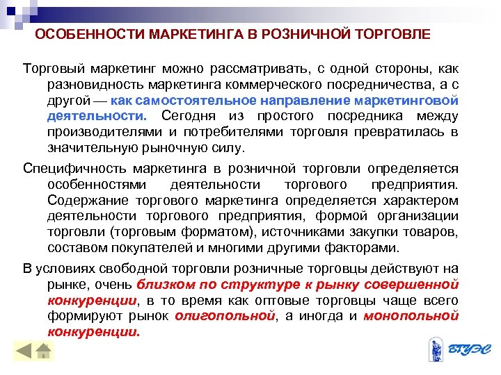 ОСОБЕННОСТИ МАРКЕТИНГА В РОЗНИЧНОЙ ТОРГОВЛЕ Торговый маркетинг можно рассматривать, с одной стороны, как разновидность маркетинга коммерческого посредничества, а с другой — как самостоятельное направление маркетинговой деятельности. Сегодня из простого посредника между производителями и потребителями торговля превратилась в значительную рыночную силу. Специфичность маркетинга в розничной торговли определяется особенностями деятельности торгового предприятия. Содержание торгового маркетинга определяется характером деятельности торгового предприятия, формой организации торговли (торговым форматом), источниками закупки товаров, составом покупателей и многими другими факторами. В условиях свободной торговли розничные торговцы действуют на рынке, очень близком по структуре к рынку совершенной конкуренции, в то время как оптовые торговцы чаще всего формируют рынок олигопольной, а иногда и монопольной конкуренции.