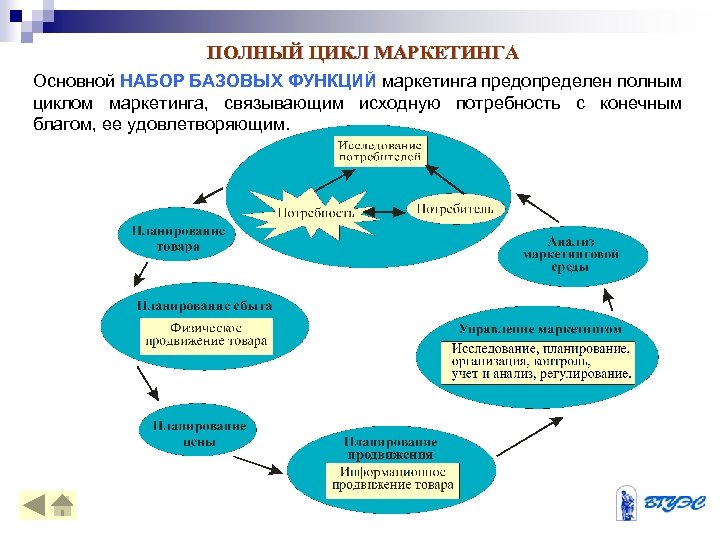 ПОЛНЫЙ ЦИКЛ МАРКЕТИНГА Основной НАБОР БАЗОВЫХ ФУНКЦИЙ маркетинга предопределен полным циклом маркетинга, связывающим исходную потребность с конечным благом, ее удовлетворяющим.
