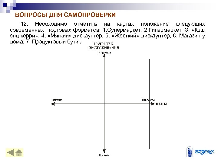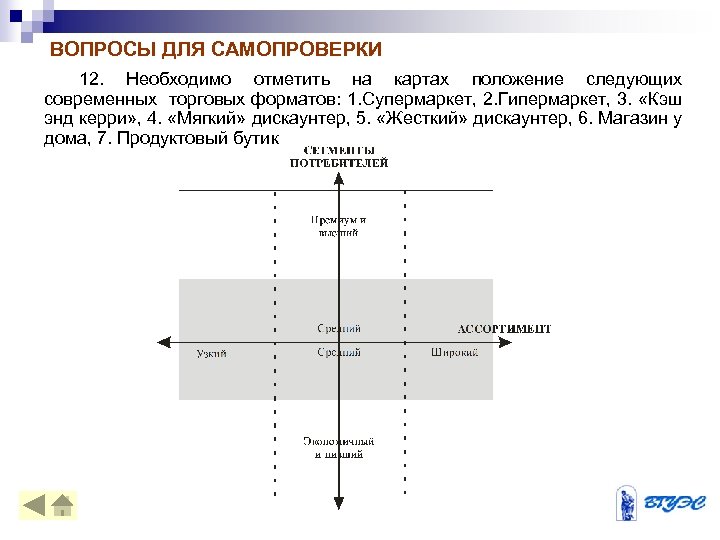 ВОПРОСЫ ДЛЯ САМОПРОВЕРКИ 1. Перечислите и раскройте содержание тенденций на рынке розничной торговли. 2. К какому типу относится рынок продовольственного ритела России и почему? 3. Какие современные торговые форматы ориентированы на высший сегмент покупателей? 4. Какие торговые форматы ориентированы на средний сегмент потребителей? 5. Какие торговые форматы ориентированы на экономичный сегмент? 6. На какие сегменты потребителей ориентирован супермаркет? 7. На какие сегменты потребителей ориентирован гипермаркет? 8. На какие сегменты потребителей ориентирован «Магазин у дома» ? 9. На какие сегменты потребителей ориентирован «Кэш энд керри» ? 10. На какие сегменты потребителей ориентированы мягкие и жесткие дискаунтеры? 11. Перечислите достоинства и недостатки стратегии мультиформатности