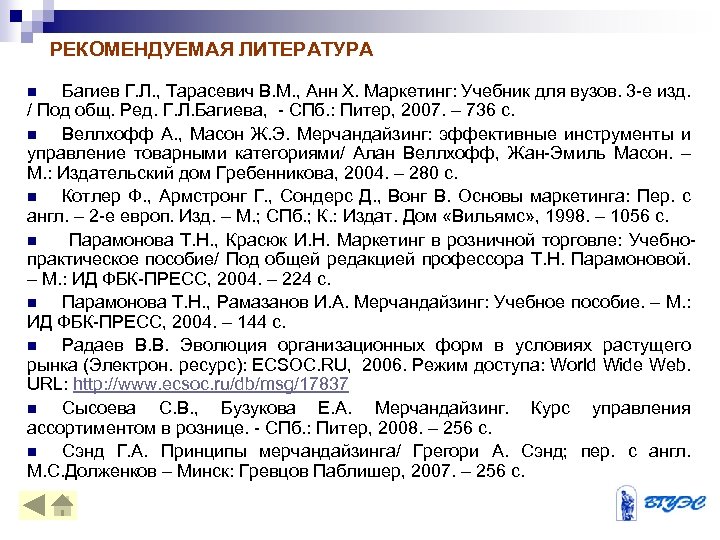 РЕКОМЕНДУЕМАЯ ЛИТЕРАТУРА Багиев Г. Л. , Тарасевич В. М. , Анн Х. Маркетинг: Учебник для вузов. 3 -е изд. / Под общ. Ред. Г. Л. Багиева, - СПб. : Питер, 2007. – 736 с. n Веллхофф А. , Масон Ж. Э. Мерчандайзинг: эффективные инструменты и управление товарными категориями/ Алан Веллхофф, Жан-Эмиль Масон. – М. : Издательский дом Гребенникова, 2004. – 280 с. n Котлер Ф. , Армстронг Г. , Сондерс Д. , Вонг В. Основы маркетинга: Пер. с англ. – 2 -е европ. Изд. – М. ; СПб. ; К. : Издат. Дом «Вильямс» , 1998. – 1056 с. n Парамонова Т. Н. , Красюк И. Н. Маркетинг в розничной торговле: Учебнопрактическое пособие/ Под общей редакцией профессора Т. Н. Парамоновой. – М. : ИД ФБК-ПРЕСС, 2004. – 224 с. n Парамонова Т. Н. , Рамазанов И. А. Мерчандайзинг: Учебное пособие. – М. : ИД ФБК-ПРЕСС, 2004. – 144 с. n Радаев В. В. Эволюция организационных форм в условиях растущего рынка (Электрон. ресурс): ECSOC. RU, 2006. Режим доступа: World Wide Web. URL: http: //www. ecsoc. ru/db/msg/17837 n Сысоева С. В. , Бузукова Е. А. Мерчандайзинг. Курс управления ассортиментом в рознице. - СПб. : Питер, 2008. – 256 с. n Сэнд Г. А. Принципы мерчандайзинга/ Грегори А. Сэнд; пер. с англ. М. С. Долженков – Минск: Гревцов Паблишер, 2007. – 256 с. n
