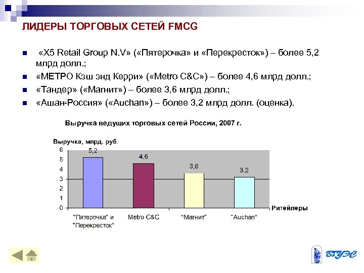 ЛИДЕРЫ ТОРГОВЫХ СЕТЕЙ FMCG n n «X 5 Retail Group N. V» ( «Пятерочка» и «Перекресток» ) – более 5, 2 млрд долл. ; «МЕТРО Кэш энд Керри» ( «Metro C&C» ) – более 4, 6 млрд долл. ; «Тандер» ( «Магнит» ) – более 3, 6 млрд долл. ; «Ашан-Россия» ( «Auchan» ) – более 3, 2 млрд долл. (оценка).