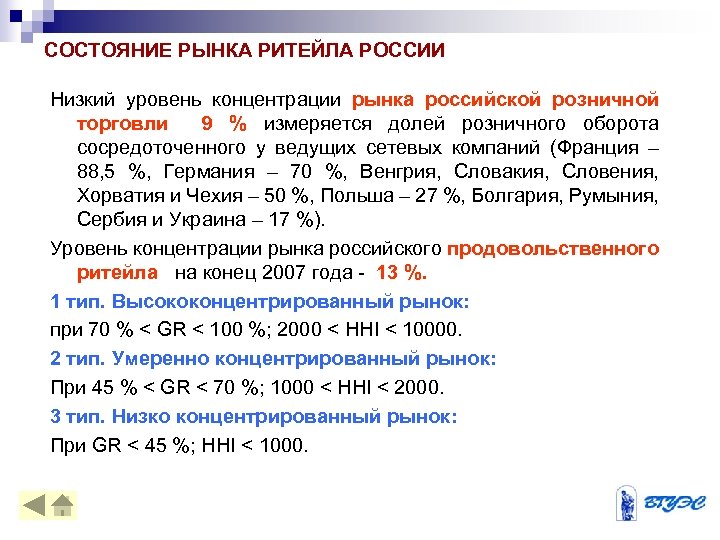 СОСТОЯНИЕ РЫНКА РИТЕЙЛА РОССИИ Низкий уровень концентрации рынка российской розничной торговли 9 % измеряется долей розничного оборота сосредоточенного у ведущих сетевых компаний (Франция – 88, 5 %, Германия – 70 %, Венгрия, Словакия, Словения, Хорватия и Чехия – 50 %, Польша – 27 %, Болгария, Румыния, Сербия и Украина – 17 %). Уровень концентрации рынка российского продовольственного ритейла на конец 2007 года - 13 %. 1 тип. Высококонцентрированный рынок: при 70 % < GR < 100 %; 2000 < HHI < 10000. 2 тип. Умеренно концентрированный рынок: При 45 % < GR < 70 %; 1000 < HHI < 2000. 3 тип. Низко концентрированный рынок: При GR < 45 %; HHI < 1000.