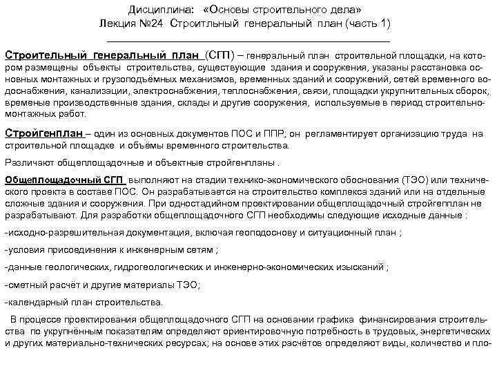 Дисциплина: «Основы строительного дела» Лекция № 24 Строитльный генеральный план (часть 1) Строительный генеральный план (СГП) – генеральный план строительной площадки, на котором размещены объекты строительства, существующие здания и сооружения, указаны расстановка основных монтажных и грузоподъёмных механизмов, временных зданий и сооружений, сетей временного водоснабжения, канализации, электроснабжения, теплоснабжения, связи, площадки укрупнительных сборок, временые производственные здания, склады и другие сооружения, используемые в период строительномонтажных работ. Стройгенплан – один из основных документов ПОС и ППР; он регламентирует организацию труда на строительной площадке и объёмы временного строительства. Различают общеплощадочные и объектные стройгенпланы. Общеплощадочный СГП выполняют на стадии технико-экономического обоснования (ТЭО) или технического проекта в составе ПОС. Он разрабатывается на строительство комплекса зданий или на отдельные сложные здания и сооружения. При одностадийном проектировании общеплощадочный стройгепплан не разрабатывают. Для разработки общеплощадочного СГП необходимы следующие исходные данные : -исходно-разрешительная документация, включая геоподоснову и ситуационный план ; -условия присоединения к инженерным сетям ; -данные геологических, гидрогеологических и инженерно-экономических изысканий ; -сметный расчёт и другие материалы ТЭО; -календарный план строительства. В процессе проектирования общеплощадочного СГП на основании графика финансирования строительства по укрупнённым показателям определяют ориентировочную потребность в трудовых, энергетических и других материально-технических ресурсах; на основе этих расчётов определяют виды, количество и пло-