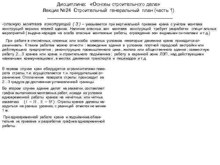 Дисциплина: «Основы строительного дела» Лекция № 24 Строительный генеральный план (часть 1) -опасную монтажа конструкций ( З ) – указывается при вертикальной привязке крана с учётом монтажа конструкций верхних этажей здания. Наличие опасных зон монтажа конструкций требует разработки специ- альных мероприятий ( выдача нарядов на особо опасные монтажные работы, ограждение зон видимыми си-гналами и т. д. ) При работе в стеснённых, сложных или особо сложных условиях некоторые движения крана приходится ограничивать. К таким работам можно отнести : возведение здания в условиях плотной городской застройки или действующего предприятия ; реконструкцию промышленного цеха , жилого или общественного здания ; совместную работу 2… 3 кранов или крана и строительного подъёмника ; работу в охранной зоне ЛЭП , над действующими наземными коммуникациями , в местах движения транспорта и пешеходов и т. д. В первом случае кран оборудуется ограничителями поворота стрелы, т. е. осуществляется т. н. принудительное ограничение. Отллючение поворота стрелы происходит за 2… 3 градуса до достижения установленной границы. Во втором случае здание делят на захватки, составляют график выполнения монтажных работ, исходя из условия одновременной работы кранов на нечётных или чётных захватках ( I – III , II – IУ ). Стрелы кранов должны находиться на разных уровнях, с разницей отметок не менее 1 м. При одновременной работе крана и подъёмника обязательна их привязка и разработка графика одновременной работы.