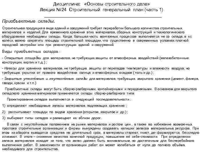 Дисциплина: «Основы строительного дела» Лекция № 24 Строительный генеральный план (часть 1) Приобъектные склады. Строительная продукция в виде зданий и сооружений требует переработки большого количества строительных материалов и изделий. Для временного хранения этих материалов, сборных конструкций и технологического оборудования необходимы склады. Когда большая часть монтажных процессов выполняется не со склада, а «с колёс» , можно сократить площадь строительной площадки, что существенно в современных условиях плотной городской застройки или при реконструкции зданий и сооружений. Виды приобъектных складов : - Открытые площадки для материалов, не требующих защиты от атмосферных воздействий (железобетон-ные конструкции, кирпич и т. д. ) ; - Навесы для хранения материалов, не требующих защиты от перепадов температуры и влажности воздуха, но требующих укрытия от прямого воздействия солнца и атмосферных осадков ( толь и др. ) ; - Закрытые утеплённые и неутеплённые склады для материалов, требующих закрытого хранения (цемент, фанера, гвозди, краски и т. п. ) Приобъектные склады могут быть сборно-разборными, контейнерными и передвижными. В основном для закрытого складского хранения материалов применяются склады сборно-разборного типа. Проектирование складов выполняется в следующей последовательности : 1) определяют необходимые запасы материалов, подлежащих хранению ; 2) рассчитывают площади по видам хранения (открытое, закрытое и др. ) ; 3) выбирают типы складов и размещают их вблизи дорог. В связи с неустойчивым положением на рынке материалов и ростом цен , а также во избежание возмож-ных простоев строительные организации и фирмы вынуждены создавать излишки запасов материальных ресурсов. При этом из оборота выводятся средства на длительный срок, а материалы стареют, гниют, де- формируются, бесследно исчезают. В итоге – снижение качества конечной продукции, повышение её себе-стоимости. При определении запаса материалов исходят из того, что запас должен быть минимальным, но достаточным для бесперебойного выполнения работ. В зависимости от организации работ он может колебаться от нуля до полного объёма, необходимого для строительства.