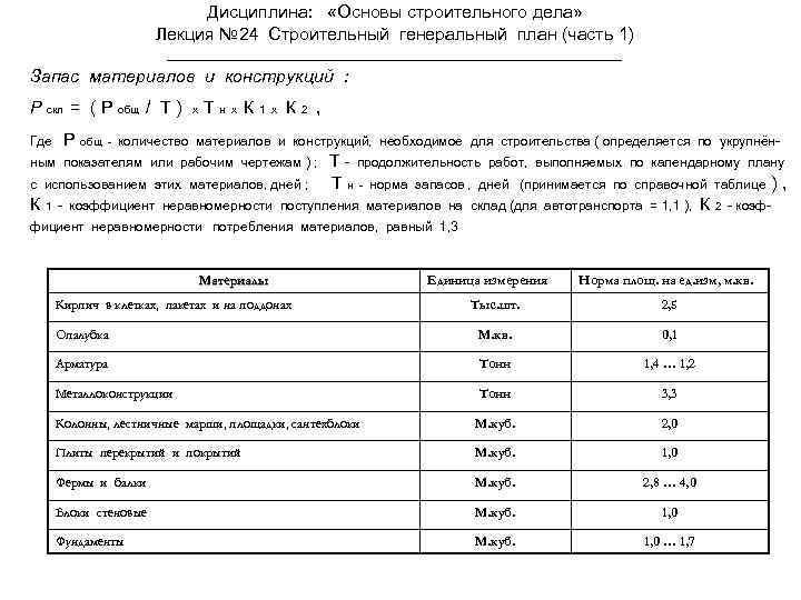 Дисциплина: «Основы строительного дела» Лекция № 24 Строительный генеральный план (часть 1) Запас материалов и конструкций : Р скл = ( Р общ / Т ) Где Р общ - х Тнх. К 1 х К 2 , количество материалов и конструкций, необходимое для строительства ( определяется по укрупнён- Т - продолжительность работ, выполняемых по календарному плану с использованием этих материалов, дней ; Т н - норма запасов , дней (принимается по справочной таблице ) , К 1 - коэффициент неравномерности поступления материалов на склад (для автотранспорта = 1, 1 ), К 2 - коэфным показателям или рабочим чертежам ) ; фициент неравномерности потребления материалов, равный 1, 3 Материалы Кирпич в клетках, пакетах и на поддонах Единица измерения Норма площ. на ед. изм, м. кв. Тыс. шт. 2, 5 Опалубка М. кв. 0, 1 Арматура Тонн 1, 4 … 1, 2 Металлоконструкции Тонн 3, 3 Колонны, лестничные марши, площадки, сантехблоки М. куб. 2, 0 Плиты перекрытий и покрытий М. куб. 1, 0 Фермы и балки М. куб. 2, 8 … 4, 0 Блоки стеновые М. куб. 1, 0 Фундаменты М. куб. 1, 0 … 1, 7