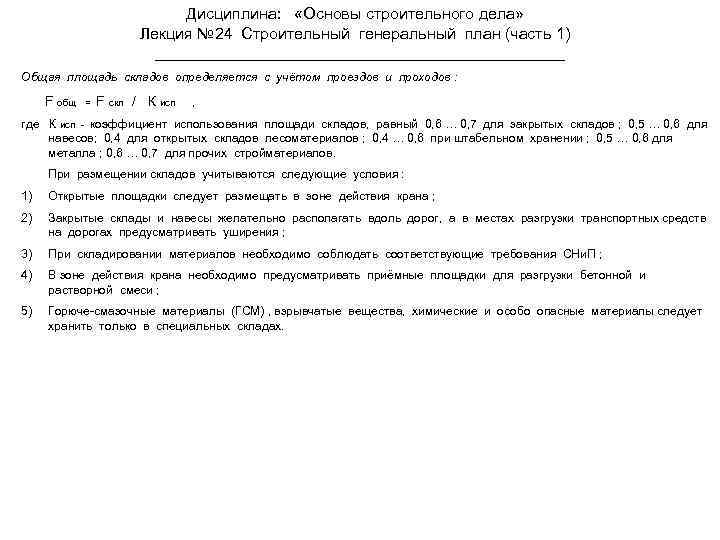 Дисциплина: «Основы строительного дела» Лекция № 24 Строительный генеральный план (часть 1) Общая площадь складов определяется с учётом проездов и проходов : F общ = F скл / К исп , где К исп - коэффициент использования площади складов, равный 0, 6 … 0, 7 для закрытых складов ; 0, 5 … 0, 6 для навесов; 0, 4 для открытых складов лесоматериалов ; 0, 4 … 0, 6 при штабельном хранении ; 0, 5 … 0, 6 для металла ; 0, 6 … 0, 7 для прочих стройматериалов. При размещении складов учитываются следующие условия : 1) Открытые площадки следует размещать в зоне действия крана ; 2) Закрытые склады и навесы желательно располагать вдоль дорог, а в местах разгрузки транспортных средств на дорогах предусматривать уширения ; 3) При складировании материалов необходимо соблюдать соответствующие требования СНи. П ; 4) В зоне действия крана необходимо предусматривать приёмные площадки для разгрузки бетонной и растворной смеси ; 5) Горюче-смазочные материалы (ГСМ) , взрывчатые вещества, химические и особо опасные материалы следует хранить только в специальных складах.