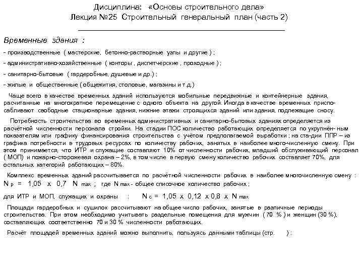 Дисциплина: «Основы строительного дела» Лекция № 25 Строительный генеральный план (часть 2) Временные здания : - производственные ( мастерские, бетонно-растворные узлы и другие ) ; - административно-хозяйственные ( конторы , диспетчерские , проходные ) ; - санитарно-бытовые ( гардеробные, душевые и др. ) ; - жилые и общественные ( общежития, столовые, магазины и т. д. ) Чаще всего в качестве временных зданий используются мобильные передвижные и контейнерные здания, расчитанные на многократное перемещение с одного объекта на другой. Иногда в качестве временных приспосабливают свободные стационарные здания, нижние этажи строящихся зданий или здания, подлежащие сносу. Потребность строительства во временных административных и санитарно-бытовых зданиях определяется из расчётной численности персонала стройки. На стадии ПОС количество работающих определяется по укрупнён- ным показателям или графику финансирования строительства с учётом предполагаемой выработки ; на ста-дии ППР – из графика потребности в трудовых ресурсах по количеству рабочих, занятых в наиболее много-численную смену. При этом принимается, что ИТР и служащие составляют 10% от численности рабочих, младший обслуживающий персонал ( МОП) и пожарно-сторожевая охрана – 2%, в том числе в первую смену количество рабочих составляет 70%, для остальных категорий работающих – 80%. Комплекс временных зданий рассчитывается по расчётной численности рабочих в наиболее многочисленную смену : N p = 1, 05 х 0, 7 N max ; где N max - общее списочное количество рабочих ; для ИТР и МОП, служащих и охраны : N c = 1, 05 х 0, 12 х 0, 8 х N max Площади гардеробных и сушилок рассчитывают на общее число рабочих, занятые в различные периоды строительства. При этом необходимо учитывать раздельные помещения для мужчин ( 70 % ) и женщин (30 %), составляющих соответственно 70 и 30 % численности работающих. Расчёт площадей временных зданий можно выполнить, пользуясь данными таблицы (стр. ):