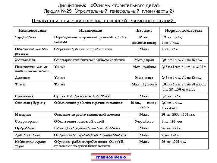 Дисциплина: «Основы строительного дела» Лекция № 25 Строительный генеральный план (часть 2) Показатели для определения площадей временных зданий. Наименование Назначение Ед. изм. Гардеробная Переодевание и хранение уличной и спецодежды М. кв. , Двойной шкаф Помещение для согревания Согревание, отдых и приём пищи Умывальная Санитарно-гигиеническое обслуж. рабочих Помещение для личной гигиены женщ. То же М. кв. /кабина Душевая То же М. кв, сетка Туалет То же М. кв. , 1 устр-во Сушильная Сушка спецодежды и спецобуви Столовая ( буфет ) М. кв. / кран Нормат. показатель 0, 9 на 1 чел, 1 на 1 чел. 0, 05 на 1 чел / 1 на 15 чел. 0, 18 на 1 чел / 1 на 15… 100 ч 0, 43 на 1 чел / 1 на 12 чел 0, 07 на 1 чел / 1 на 20 женщ 1 на 25 … 30 мужчин М. кв. 0, 2 на 1 чел Обеспечение рабочих горячим питанием М. кв. , посад. место 0, 6 на 1 чел. 1 на 4 чел. Медпункт Оказание первой медицинской помощи М. кв. Сатураторная Обеспечение питьевой водой Прорабская 20 на 200 … 300 чел. Устройство 1 на 150 чел. Размещение администр. -техн. персонала М. кв. 24 на 5 чел. Диспетчерская Оперативное руководство стр-вом объекта М. кв. 7 на 1 чел. Кабинет по охране труда Обучение рабочих требованиям ОТ и ТБ, правилам пожарной безопасности М. кв. 20 на 1000 чел главное меню