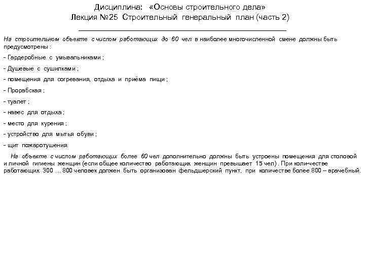 Дисциплина: «Основы строительного дела» Лекция № 25 Строительный генеральный план (часть 2) На строительном объекте с числом работающих до 60 чел в наиболее многочисленной смене должны быть предусмотрены : - Гардеробные с умывальниками ; - Душевые с сушилками ; - помещения для согревания, отдыха и приёма пищи ; - Прорабская ; - туалет ; - навес для отдыха ; - место для курения ; - устройство для мытья обуви ; - щит пожаротушения. На объекте с числом работающих более 60 чел дополнительно должны быть устроены помещения для столовой и личной гигиены женщин (если общее количество работающих женщин превышает 15 чел). При коли-честве работающих 300 … 800 человек должен быть организован фельдшерский пункт, при количестве более 800 – врачебный.