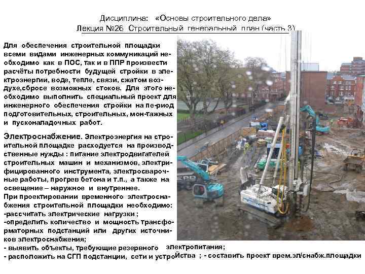 Дисциплина: «Основы строительного дела» Лекция № 26 Строительный генеральный план (часть 3) Для обеспечения строительной площадки всеми видами инженерных коммуникаций необходимо как в ПОС, так и в ППР произвести расчёты потребности будущей стройки в электроэнергии, воде, тепле, связи, сжатом воздухе, сбросе возможных стоков. Для этого необходимо выполнить специальный проект для инженерного обеспечения стройки на пе-риод подготовительных, строительных, мон-тажных и пусконаладочных работ. Электроснабжение. Электроэнергия на строительной площадке расходуется на производственные нужды : питание электродвигателей строительных машин и механизмов, электрифицированного инструмента, электросварочные работы, прогрев бетона и т. п. , а также на освещение – наружное и внутреннее. При проектировании временного электроснабжения строительной площадки необходимо: -рассчитать электрические нагрузки ; -определить количество и мощность трансформаторных подстанций или других источников электроснабжения; - выявить объекты, требующие резервного электропитания; - расположить на СГП подстанции, сети и устро. Йства ; - составить проект врем. эл/снабж. площадки