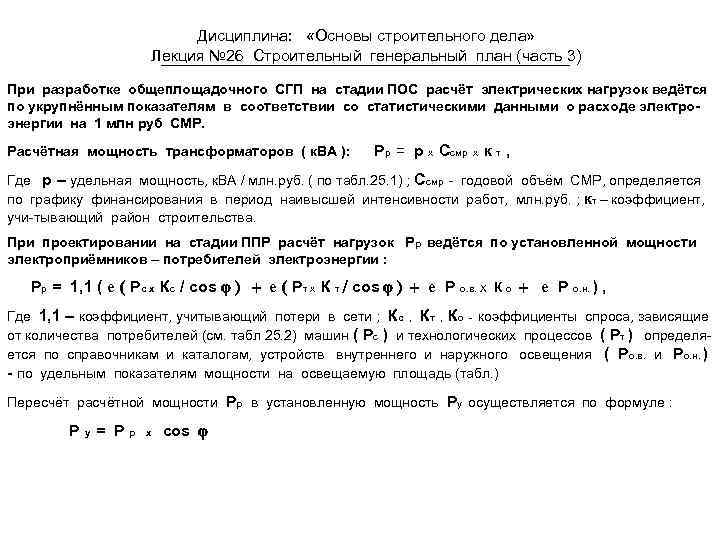 Дисциплина: «Основы строительного дела» Лекция № 26 Строительный генеральный план (часть 3) При разработке общеплощадочного СГП на стадии ПОС расчёт электрических нагрузок ведётся по укрупнённым показателям в соответствии со статистическими данными о расходе электроэнергии на 1 млн руб СМР. Расчётная мощность трансформаторов ( к. ВА ): Рр = р х Ссмр х к т , Где р – удельная мощность, к. ВА / млн. руб. ( по табл. 25. 1) ; Ссмр - годовой объём СМР, определяется по графику финансирования в период наивысшей интенсивности работ, млн. руб. ; кт – коэффициент, учи-тывающий район строительства. При проектировании на стадии ППР расчёт нагрузок Р р ведётся по установленной мощности электроприёмников – потребителей электроэнергии : Рр = 1, 1 ( е ( Рс х Кс / соs j ) + е ( Pт х К т / cos j ) + е Р о. в. Х К о + е Р о. н. ) , Где 1, 1 – коэффициент, учитывающий потери в сети ; Кс , Кт , Ко - коэффициенты спроса, зависящие от количества потребителей (см. табл 25. 2) машин ( Рс ) и технологических процессов ( Рт ) определяется по справочникам и каталогам, устройств внутреннего и наружного освещения ( Ро. в. и Ро. н. ) - по удельным показателям мощности на освещаемую площадь (табл. ) Пересчёт расчётной мощности Рр в установленную мощность Ру осуществляется по формуле : Ру= Рр х соs j