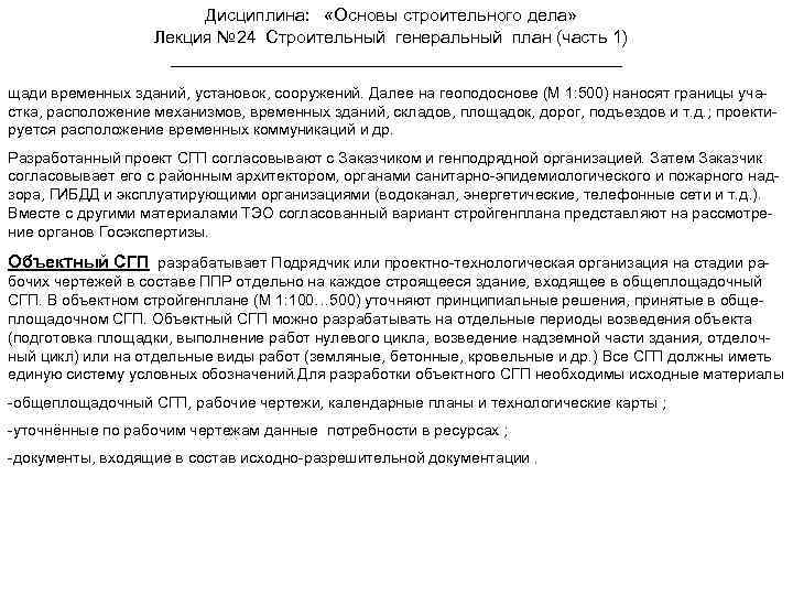 Дисциплина: «Основы строительного дела» Лекция № 24 Строительный генеральный план (часть 1) щади временных зданий, установок, сооружений. Далее на геоподоснове (М 1: 500) наносят границы участка, расположение механизмов, временных зданий, складов, площадок, дорог, подъездов и т. д. ; проектируется расположение временных коммуникаций и др. Разработанный проект СГП согласовывают с Заказчиком и генподрядной организацией. Затем Заказчик согласовывает его с районным архитектором, органами санитарно-эпидемиологического и пожарного надзора, ГИБДД и эксплуатирующими организациями (водоканал, энергетические, телефонные сети и т. д. ). Вместе с другими материалами ТЭО согласованный вариант стройгенплана представляют на рассмотрение органов Госэкспертизы. Объектный СГП разрабатывает Подрядчик или проектно-технологическая организация на стадии рабочих чертежей в составе ППР отдельно на каждое строящееся здание, входящее в общеплощадочный СГП. В объектном стройгенплане (М 1: 100… 500) уточняют принципиальные решения, принятые в общеплощадочном СГП. Объектный СГП можно разрабатывать на отдельные периоды возведения объекта (подготовка площадки, выполнение работ нулевого цикла, возведение надземной части здания, отделочный цикл) или на отдельные виды работ (земляные, бетонные, кровельные и др. ) Все СГП должны иметь единую систему условных обозначений. Для разработки объектного СГП необходимы исходные материалы -общеплощадочный СГП, рабочие чертежи, календарные планы и технологические карты ; -уточнённые по рабочим чертежам данные потребности в ресурсах ; -документы, входящие в состав исходно-разрешительной документации.