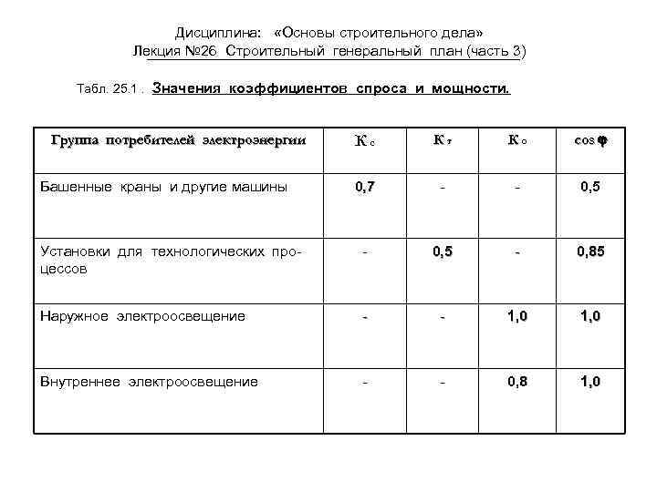Дисциплина: «Основы строительного дела» Лекция № 26 Строительный генеральный план (часть 3) Табл. 25. 1. Значения коэффициентов спроса и мощности. Кс Кт Ко cо s j 0, 7 - - 0, 5 Установки для технологических процессов - 0, 5 - 0, 85 Наружное электроосвещение - - 1, 0 Внутреннее электроосвещение - - 0, 8 1, 0 Группа потребителей электроэнергии Башенные краны и другие машины