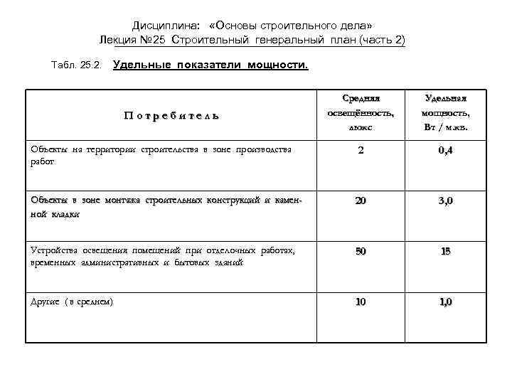 Дисциплина: «Основы строительного дела» Лекция № 25 Строительный генеральный план (часть 2) Табл. 25. 2. Удельные показатели мощности. Средняя освещённость, люкс Удельная мощность, Вт / м. кв. Объекты на территории строительства в зоне производства работ 2 0, 4 Объекты в зоне монтажа строительных конструкций и каменной кладки 20 3, 0 Устройства освещения помещений при отделочных работах, временных административных и бытовых зданий 50 15 Другие ( в среднем) 10 1, 0 Потребитель