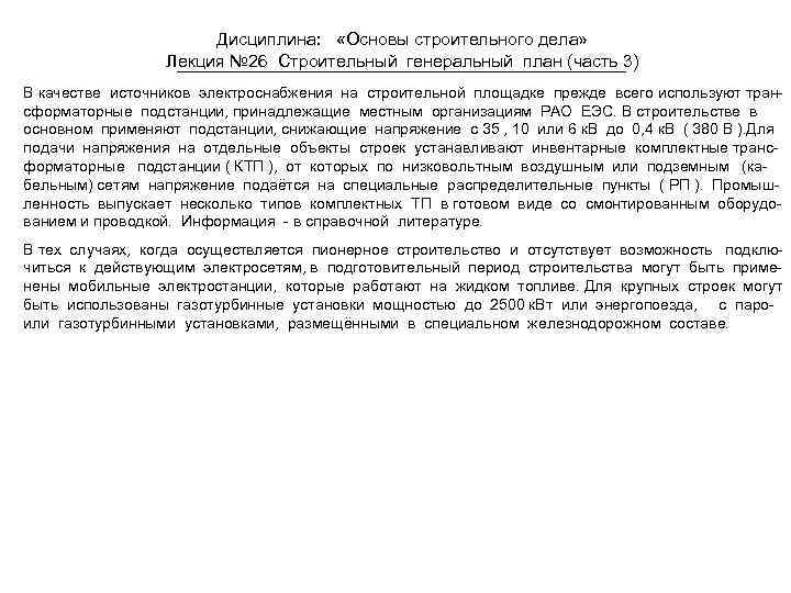 Дисциплина: «Основы строительного дела» Лекция № 26 Строительный генеральный план (часть 3) В качестве источников электроснабжения на строительной площадке прежде всего используют трансформаторные подстанции, принадлежащие местным организациям РАО ЕЭС. В строительстве в основном применяют подстанции, снижающие напряжение с 35 , 10 или 6 к. В до 0, 4 к. В ( 380 В ). Для подачи напряжения на отдельные объекты строек устанавливают инвентарные комплектные трансформаторные подстанции ( КТП ), от которых по низковольтным воздушным или подземным (кабельным) сетям напряжение подаётся на специальные распределительные пункты ( РП ). Промышленность выпускает несколько типов комплектных ТП в готовом виде со смонтированным оборудованием и проводкой. Информация - в справочной литературе. В тех случаях, когда осуществляется пионерное строительство и отсутствует возможность подключиться к действующим электросетям, в подготовительный период строительства могут быть применены мобильные электростанции, которые работают на жидком топливе. Для крупных строек могут быть использованы газотурбинные установки мощностью до 2500 к. Вт или энергопоезда, с пароили газотурбинными установками, размещёнными в специальном железнодорожном составе.