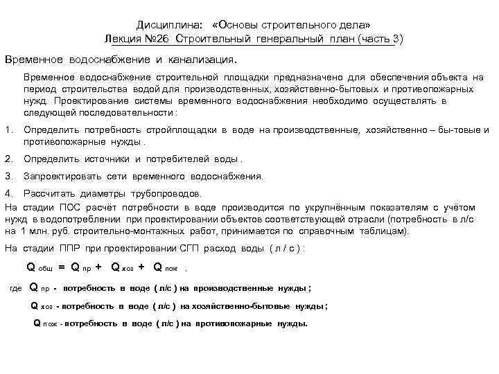 Дисциплина: «Основы строительного дела» Лекция № 26 Строительный генеральный план (часть 3) Временное водоснабжение и канализация. Временное водоснабжение строительной площадки предназначено для обеспечения объекта на период строительства водой для производственных, хозяйственно-бытовых и противопожарных нужд. Проектирование системы временного водоснабжения необходимо осуществлять в следующей последовательности : 1. Определить потребность стройплощадки в воде на производственные, хозяйственно – бы-товые и противопожарные нужды. 2. Определить источники и потребителей воды. 3. Запроектировать сети временного водоснабжения. 4. Рассчитать диаметры трубопроводов. На стадии ПОС расчёт потребности в воде производится по укрупнённым показателям с учётом нужд в водопотреблении проектировании объектов соответствующей отрасли (потребность в л/с на 1 млн. руб. строительно-монтажных работ, принимается по справочным таблицам). На стадии ППР при проектировании СГП расход воды ( л / с ) : Q общ = Q пр + Q хоз + Q пож где Q пр , - потребность в воде ( л/с ) на производственные нужды ; Q хоз - потребность в воде ( л/с ) на хозяйственно-бытовые нужды ; Q пож - потребность в воде ( л/с ) на противопожарные нужды.