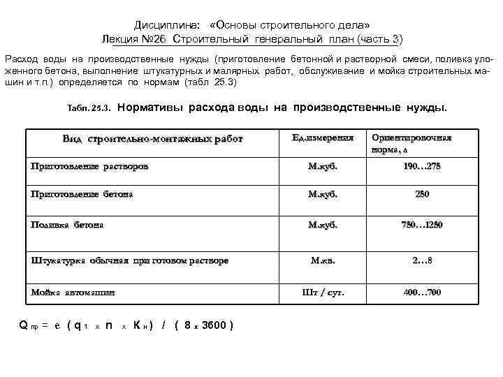 Дисциплина: «Основы строительного дела» Лекция № 26 Строительный генеральный план (часть 3) Расход воды на производственные нужды (приготовление бетонной и растворной смеси, поливка уложенного бетона, выполнение штукатурных и малярных работ, обслуживание и мойка строительных машин и т. п. ) определяется по нормам (табл 25. 3) Табл. 25. 3. Нормативы расхода воды на производственные нужды. Вид строительно-монтажных работ Ед. измерения Ориентировочная норма, л Приготовление растворов М. куб. 190… 275 Приготовление бетона М. куб. 250 Поливка бетона М. куб. 750… 1250 Штукатурка обычная при готовом растворе М. кв. 2… 8 Шт / сут. 400… 700 Мойка автомашин Q пр = е ( q 1 х n х К н ) / ( 8 х 3600 )