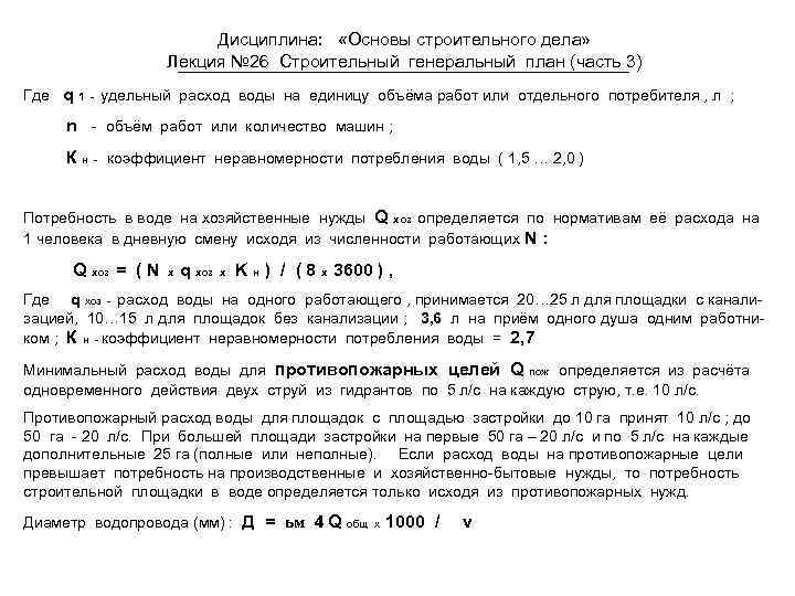 Дисциплина: «Основы строительного дела» Лекция № 26 Строительный генеральный план (часть 3) Где q удельный расход воды на единицу объёма работ или отдельного потребителя , л ; 1 - n - объём работ или количество машин ; Кн - коэффициент неравномерности потребления воды ( 1, 5 … 2, 0 ) Потребность в воде на хозяйственные нужды Q хоз определяется по нормативам её расхода на 1 человека в дневную смену исходя из численности работающих N : Q хоз = ( N x q хоз х K н ) / ( 8 х 3600 ) , Где q хоз - расход воды на одного работающего , принимается 20… 25 л для площадки с канализацией, 10… 15 л для площадок без канализации ; 3, 6 л на приём одного душа одним работником ; К н - коэффициент неравномерности потребления воды = 2, 7 Минимальный расход воды для противопожарных целей Q пож определяется из расчёта одновременного действия двух струй из гидрантов по 5 л/с на каждую струю, т. е. 10 л/с. Противопожарный расход воды для площадок с площадью застройки до 10 га принят 10 л/с ; до 50 га - 20 л/с. При большей площади застройки на первые 50 га – 20 л/с и по 5 л/с на каждые дополнительные 25 га (полные или неполные). Если расход воды на противопожарные цели превышает потребность на производственные и хозяйственно-бытовые нужды, то потребность строительной площадки в воде определяется только исходя из противопожарных нужд. Диаметр водопровода (мм) : Д = ьм 4 Q общ х 1000 / v