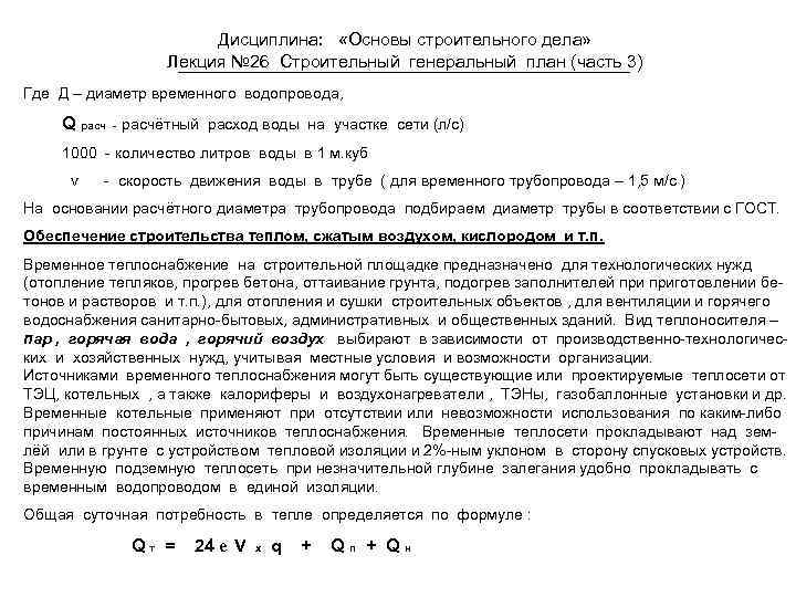Дисциплина: «Основы строительного дела» Лекция № 26 Строительный генеральный план (часть 3) Где Д – диаметр временного водопровода, Q расч - расчётный расход воды на участке сети (л/с) 1000 - количество литров воды в 1 м. куб v - скорость движения воды в трубе ( для временного трубопровода – 1, 5 м/с ) На основании расчётного диаметра трубопровода подбираем диаметр трубы в соответствии с ГОСТ. Обеспечение строительства теплом, сжатым воздухом, кислородом и т. п. Временное теплоснабжение на строительной площадке предназначено для технологических нужд (отопление тепляков, прогрев бетона, оттаивание грунта, подогрев заполнителей приготовлении бетонов и растворов и т. п. ), для отопления и сушки строительных объектов , для вентиляции и горячего водоснабжения санитарно-бытовых, административных и общественных зданий. Вид теплоносителя – пар , горячая вода , горячий воздух выбирают в зависимости от производственно-технологических и хозяйственных нужд, учитывая местные условия и возможности организации. Источниками временного теплоснабжения могут быть существующие или проектируемые теплосети от ТЭЦ, котельных , а также калориферы и воздухонагреватели , ТЭНы, газобаллонные установки и др. Временные котельные применяют при отсутствии или невозможности использования по каким-либо причинам постоянных источников теплоснабжения. Временные теплосети прокладывают над землёй или в грунте с устройством тепловой изоляции и 2%-ным уклоном в сторону спусковых устройств. Временную подземную теплосеть при незначительной глубине залегания удобно прокладывать с временным водопроводом в единой изоляции. Общая суточная потребность в тепле определяется по формуле : Qт = 24 е V x q + Qп + Qн