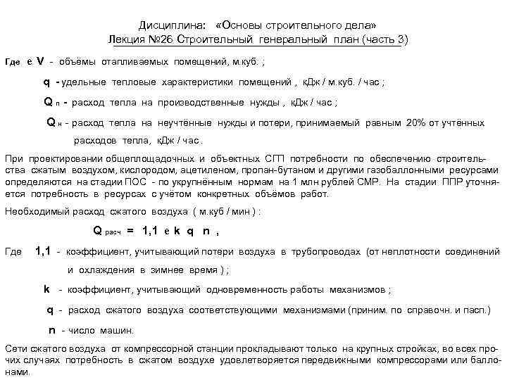 Дисциплина: «Основы строительного дела» Лекция № 26 Строительный генеральный план (часть 3) Где е V - объёмы отапливаемых помещений, м. куб. ; q - удельные тепловые характеристики помещений , к. Дж / м. куб. / час ; Q п - расход тепла на производственные нужды , к. Дж / час ; Q н - расход тепла на неучтённые нужды и потери, принимаемый равным 20% от учтённых расходов тепла, к. Дж / час. При проектировании общеплощадочных и объектных СГП потребности по обеспечению строительства сжатым воздухом, кислородом, ацетиленом, пропан-бутаном и другими газобаллонными ресурсами определяются на стадии ПОС - по укрупнённым нормам на 1 млн рублей СМР. На стадии ППР уточняется потребность в ресурсах с учётом конкретных объёмов работ. Необходимый расход сжатого воздуха ( м. куб / мин ) : Q расч = 1, 1 е k q n , Где 1, 1 - коэффициент, учитывающий потери воздуха в трубопроводах (от неплотности соединений и охлаждения в зимнее время ) ; k - коэффициент, учитывающий одновременность работы механизмов ; q - расход сжатого воздуха соответствующими механизмами (приним. по справочн. и пасп. ) n - число машин. Сети сжатого воздуха от компрессорной станции прокладывают только на крупных стройках, во всех прочих случаях потребность в сжатом воздухе удовлетворяется передвижными компрессорами или баллонами.