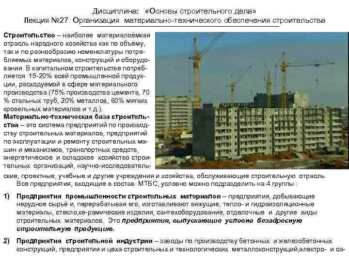 Дисциплина: «Основы строительного дела» Лекция № 27 Организация материально-технического обеспечения строительства Строительство – наиболее материалоёмкая отрасль народного хозяйства как по объёму, так и по разнообразию номенклатуры потребляемых материалов, конструкций и оборудования. В капитальном строительстве потребляется 15 -20% всей промышленной продукции, расходуемой в сфере материального производства (75% производства цемента, 70 % стальных труб, 20% металлов, 60% мягких кровельных материалов и т. д. ). Материально-техническая база строительства – это система предприятий по производству строительных материалов, предприятий по эксплуатации и ремонту строительных машин и механизмов, транспортных средств, энергетическое и складское хозяйство строительных организаций, научно-исследовательские, проектные, учебные и другие учреждения и хозяйства, обслуживающие строительную отрасль. Все предприятия, входящие в состав МТБС, условно можно подразделить на 4 группы : 1) Предприятия промышленности строительных материалов – предприятия, добывающие нерудное сырьё и, перерабатывая его, изготавливают вяжущие, тепло- и гидроизоляционные материалы, стекло, ке-рамические изделия, сантехоборудование, отделочные и другие виды строительных материалов. Это предприятия, выпускающие условно безадресную строительную продукцию. 2) Предприятия строительной индустрии – заводы по производству бетонных и железобетонных конструкций, предприятия и цеха строительных и технологических металлоконструкций, электро- и са-