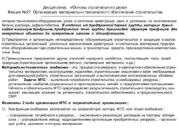 Дисциплина: «Основы строительного дела» Лекция № 27 Организация материально-технического обеспечения строительства нитарно-технического оборудования, узлов и заготовок, арматурные цеха и установки по изготовлению бетона, раствора, асфальтобетона. В отличие от предприятий первой группы, которые производят массовую продукцию, предприятия этой группы производят адресную продукцию для конкретных объектов по конкретным заказам и спецификациям. 3) Предприятия и организации, непосредственно обслуживающие строительство и входящие в состав строительных организаций : различные механические, арматурные и плотничные мастерские, предприятия, обслуживающие парк строительных машин и транспортных средств, производственно-комплектовочные базы. 4) Промышленные предприятия других отраслей народного хозяйства, поставляющие часть своей продукции строительным организациям (металл, полимерные материалы и др. ) Материально-техническое снабжение – это процесс планомерного и комплектного обеспечения строительства материалами, конструкциями, изделиями, строительными машинами и всем необходимым для нормальной работы строительных организаций и выполнения ими запланированных объёмов работ. Задачи МТС : - выявление потребности строительства в необходимых ресурсах ; установление наиболее рациональных и гарантированных связей с предприятиями-поставщиками. Чёткость и обязательность МТС предопределяет результативность строительного производства, оказывает решающее влияние на ритмичность строительства, себестоимость и продолжительность СМР. Возможны 2 вида организации МТС в строительных организациях : 1) Все функции снабжения возлагаются на хозрасчётную контору МТС или отдел снабжения : - планирование потребности в ресурсах ; - заключение и реализация договоров на поставку материалов ; - распределение между подразделениями организации приобретённых ресурсов ; - организация учёта, хранения и отпуска материалов.