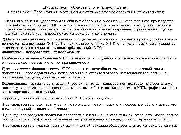 Дисциплина: «Основы строительного дела» Лекция № 27 Организация материально-технического обеспечения строительства Этот вид снабжения удовлетворяет общим требованиям организации строительного производства при небольших объёмах СМР и малой степени сборности монтируемых конструкций. Такая система снабжения приемлема в трестах механизации, специализированных организациях, где невелика номенклатура потребляемых материалов и конструкций. 2) Материально-техническое обеспечение осуществляется силами Управления производственно-технологической комплектации (УПТК). Принципиальное отличие УПТК от снабженческих организаций заключается в выполнении следующих трёх функций МТС : снабжение - переработка - комплектация. Снабженческая деятельность УПТК заключается в получении всех видов материальных ресурсов от поставщиков независимо от их принадлежности. Промышленная деятельность УПТК состоит в переработке материалов и изделий для их подготовки к непосредственному использованию в строительстве : в изготовлении нетиповых или малосерийных изделий, деталей, полуфабрикатов. Комплектация материалов и изделий состоит в их централизованной доставке на строительную площадку в соответствии с календарным планом работ и согласованными с УПТК графиками поставки материалов и конструкций. В производственно-комплектовочную базу УПТК могут входить : -Производственные цеха или участки по изготовлению нетиповых или несерийных ж/б или металлических конструкций, столярные изделия ; -Цеха, где производится частичная переработка и повышение строительной готовности материалов за счёт их раскроя, расфасовки, укрупнения (раскрой линолеума, стекла, обоев, колеровка красок и т. п. ) -Производственные участки комплектации и контейнеризации общестроительных материалов, санитар-