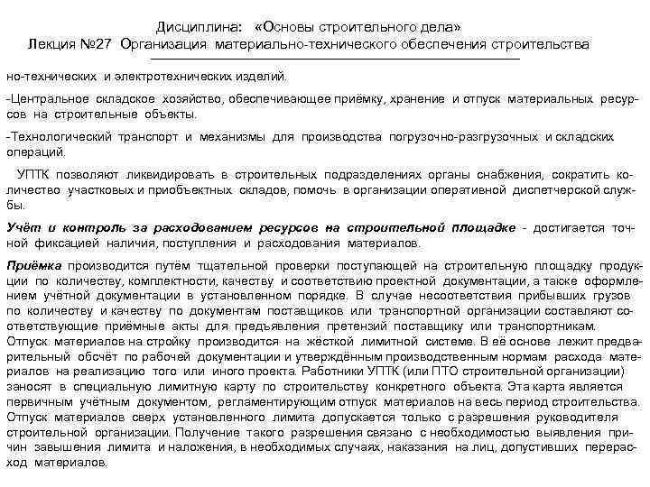Дисциплина: «Основы строительного дела» Лекция № 27 Организация материально-технического обеспечения строительства но-технических и электротехнических изделий. -Центральное складское хозяйство, обеспечивающее приёмку, хранение и отпуск материальных ресурсов на строительные объекты. -Технологический транспорт и механизмы для производства погрузочно-разгрузочных и складских операций. УПТК позволяют ликвидировать в строительных подразделениях органы снабжения, сократить количество участковых и приобъектных складов, помочь в организации оперативной диспетчерской службы. Учёт и контроль за расходованием ресурсов на строительной площадке - достигается точной фиксацией наличия, поступления и расходования материалов. Приёмка производится путём тщательной проверки поступающей на строительную площадку продукции по количеству, комплектности, качеству и соответствию проектной документации, а также оформлением учётной документации в установленном порядке. В случае несоответствия прибывших грузов по количеству и качеству по документам поставщиков или транспортной организации составляют соответствующие приёмные акты для предъявления претензий поставщику или транспортникам. Отпуск материалов на стройку производится на жёсткой лимитной системе. В её основе лежит предварительный обсчёт по рабочей документации и утверждённым производственным нормам расхода материалов на реализацию того или иного проекта. Работники УПТК (или ПТО строительной организации) заносят в специальную лимитную карту по строительству конкретного объекта. Эта карта является первичным учётным документом, регламентирующим отпуск материалов на весь период строительства. Отпуск материалов сверх установленного лимита допускается только с разрешения руководителя строительной организации. Получение такого разрешения связано с необходимостью выявления причин завышения лимита и наложения, в необходимых случаях, наказания на лиц, допустивших перерасход материалов.
