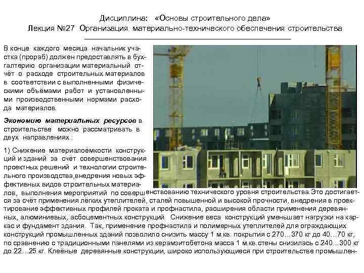 Дисциплина: «Основы строительного дела» Лекция № 27 Организация материально-технического обеспечения строительства В конце каждого месяца начальник участка (прораб) должен предоставлять в бухгалтерию организации материальный отчёт о расходе строительных материалов в соответствии с выполненными физическими объёмами работ и установленными производственными нормами расхода материалов. Экономию материальных ресурсов в строительстве можно рассматривать в двух направлениях : 1) Снижение материалоёмкости конструкций и зданий за счёт совершенствования проектных решений и технологии строительного производства, внедрения новых эффективных видов строительных материалов, выполнения мероприятий по совершенствованию технического уровня строительства. Это достигается за счёт применения лёгких утеплителей, сталей повышенной и высокой прочности, внедрения в проектирование эффективных профилей проката и профнастила, расширения области применения деревянных, алюминиевых, асбоцементных конструкций. Снижение веса конструкций уменьшает нагрузки на каркас и фундамент здания. Так, применение профнастила и полимерных утеплителей для ограждающих конструкций промышленных зданий позволило снизить массу 1 м. кв. покрытия с 270… 370 кг до 40… 70 кг, по сравнению с традиционными панелями из керамзитобетона масса 1 м. кв. стены снизилась с 240… 300 кг до 22… 25 кг. Клеёные деревянные конструкции, широко использующиеся при строительстве промышлен-