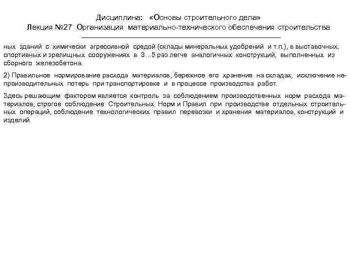 Дисциплина: «Основы строительного дела» Лекция № 27 Организация материально-технического обеспечения строительства ных зданий с химически агрессивной средой (склады минеральных удобрений и т. п. ), в выставочных, спортивных и зрелищных сооружениях в 3… 5 раз легче аналогичных конструкций, выполненных из сборного железобетона. 2) Правильное нормирование расхода материалов, бережное его хранение на складах, исключение непроизводительных потерь при транспортировке и в процессе производства работ. Здесь решающим фактором является контроль за соблюдением производственных норм расхода материалов, строгое соблюдение Строительных Норм и Правил при производстве отдельных строительных операций, соблюдение технологических правил перевозки и хранения материалов, конструкций и изделий.