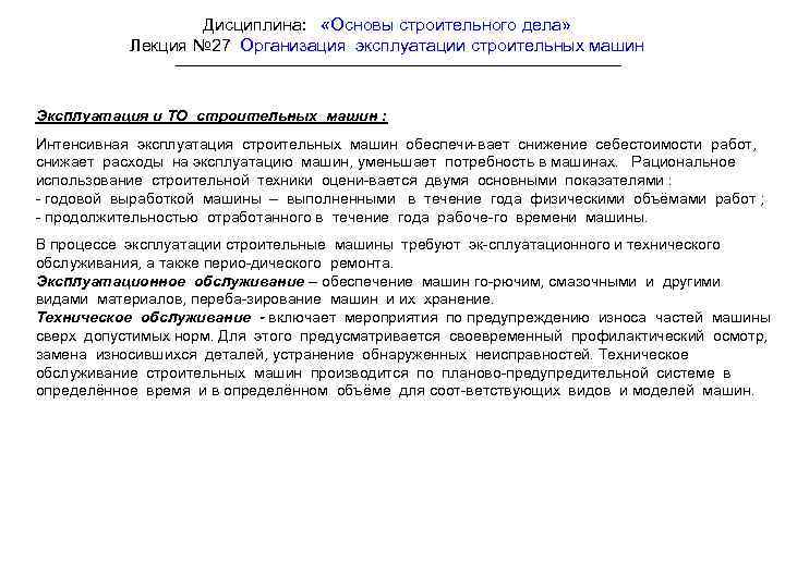 Дисциплина: «Основы строительного дела» Лекция № 27 Организация эксплуатации строительных машин Эксплуатация и ТО строительных машин : Интенсивная эксплуатация строительных машин обеспечи-вает снижение себестоимости работ, снижает расходы на эксплуатацию машин, уменьшает потребность в машинах. Рациональное использование строительной техники оцени-вается двумя основными показателями : - годовой выработкой машины – выполненными в течение года физическими объёмами работ ; - продолжительностью отработанного в течение года рабоче-го времени машины. В процессе эксплуатации строительные машины требуют эк-сплуатационного и технического обслуживания, а также перио-дического ремонта. Эксплуатационное обслуживание – обеспечение машин го-рючим, смазочными и другими видами материалов, переба-зирование машин и их хранение. Техническое обслуживание - включает мероприятия по предупреждению износа частей машины сверх допустимых норм. Для этого предусматривается своевременный профилактический осмотр, замена износившихся деталей, устранение обнаруженных неисправностей. Техническое обслуживание строительных машин производится по планово-предупредительной системе в определённое время и в определённом объёме для соот-ветствующих видов и моделей машин.