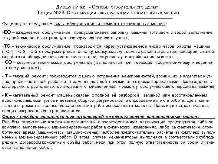 Дисциплина: «Основы строительного дела» Лекция № 28 Организация эксплуатации строительных машин Существуют следующие виды обслуживания и ремонта строительных машин : -ЕО – ежедневное обслуживание : предусматривает заправку машины топливом и водой, выполнение текущей смазки и контрольную проверку исправности узлов ; -ТО – техническое обслуживание : производится через установленное число часов работы машины (ТО-1, ТО-2, ТО-3 ); предусматривает очистку, мойку, смазку , осмотр узлов и агрегатов, приборов, сменного рабочего оборудования, крепление деталей, регулировку и опробование машины. ; - СО – сезонное техническое обслуживание ( выполняется при переходе к осенне-зимнему и весеннелетнему сезонам) ; - Т – текущий ремонт ; производится с целью устранения неисправностей, возникших в агрегатах и узлах, путём частичной разборки и замены деталей новыми или отремонтированными. Производятся в мастерских строительных организаций с привлечением к ремонту обслуживающего персонала машины; - К – капитальный ремонт машины; связан с полной её разборкой , заменой или восстановлением всех износившихся узлов и деталей, сборкой, регулировкой и опробованием их в работе. Цель капитального ремонта – полное восстановление работоспособности машины. Производятся, как правило, специализированными предприятиями. Формы расчёта строительных организаций за использование строительных машин : Расчёты строительно-монтажных организаций с подразделениями механизации производятся либо за комплекс выполненных механизированных работ в физических измерениях, либо за фактически отработанное время (машино-часы, машино-смены). Наиболее предпочтительны расчёты за комплекс выполненных механизированных работ. В этом случае механизаторы выполняют в соответствии с субподрядным договором конкретный объём работ, неся при этом полную ответственность за сроки и качество выполнения работ.