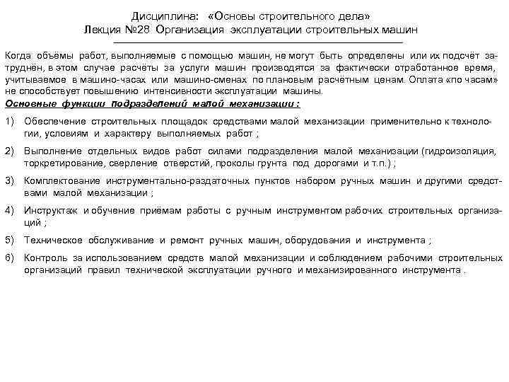 Дисциплина: «Основы строительного дела» Лекция № 28 Организация эксплуатации строительных машин Когда объёмы работ, выполняемые с помощью машин, не могут быть определены или их подсчёт затруднён, в этом случае расчёты за услуги машин производятся за фактически отработанное время, учитываемое в машино-часах или машино-сменах по плановым расчётным ценам. Оплата «по часам» не способствует повышению интенсивности эксплуатации машины. Основные функции подразделений малой механизации : 1) Обеспечение строительных площадок средствами малой механизации применительно к технологии, условиям и характеру выполняемых работ ; 2) Выполнение отдельных видов работ силами подразделения малой механизации (гидроизоляция, торкретирование, сверление отверстий, проколы грунта под дорогами и т. п. ) ; 3) Комплектование инструментально-раздаточных пунктов набором ручных машин и другими средствами малой механизации ; 4) Инструктаж и обучение приёмам работы с ручным инструментом рабочих строительных организаций ; 5) Техническое обслуживание и ремонт ручных машин, оборудования и инструмента ; 6) Контроль за использованием средств малой механизации и соблюдением рабочими строительных организаций правил технической эксплуатации ручного и механизированного инструмента.