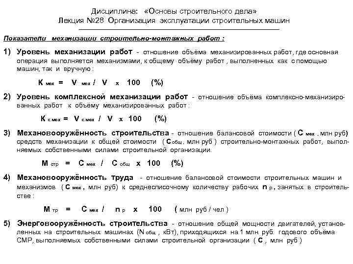 Дисциплина: «Основы строительного дела» Лекция № 28 Организация эксплуатации строительных машин Показатели механизации строительно-монтажных работ : 1) Уровень механизации работ - отношение объёма механизированных работ, где основная операция выполняется механизмами, к общему объёму работ , выполненных как с помощью машин, так и вручную : К мех = V мех / V х 100 (%) 2) Уровень комплексной механизации работ - отношение объёма комплексно-механизированных работ к объёму механизированных работ : К к. мех = V к. мех / V х 100 (%) 3) Механовооружённость строительства - отношение балансовой стоимости ( С мех , млн руб) средств механизации к общей стоимости ( Собщ , млн руб ) строительно-монтажных работ, выполняемых собственными силами строительной организации. М стр = С мех / С общ х 100 (%) 4) Механовооружённость труда - отношение балансовой стоимости строительных машин и механизмов ( С мех , млн руб) к среднесписочному количеству рабочих n р , занятых в строительстве : М тр = С мех / nр х 100 ( млн руб / чел ) 5) Энерговооружённость строительства - отношение общей мощности двигателей, установленных на строительных машинах (N общ , к. Вт), приходящихся на 1 млн. руб. годового объёма СМР, выполняемых собственными силами строительной организации ( С , млн руб )