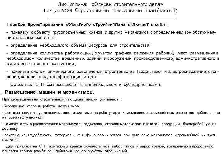 Дисциплина: «Основы строительного дела» Лекция № 24 Строительный генеральный план (часть 1) Порядок проектирования объектного стройгенплана включает в себя : - привязку к объекту грузоподъёмных кранов и других механизмов с определением зон обслуживания, опасных зон и т. п. ; - определение необходимого объёма ресурсов для строительства ; - определение количества работающих ( с учётом графика движения рабочих) , мест размещения в необходимом количестве временных зданий и сооружений производственного, административного и санитарно-бытового назначения ; - привязка систем инженерного обеспечения строительства (водо-, газо- и электроснабжение, отопление, канализация, телефонизация и т. д. ) Объектный СГП согласовывают с генподрядчиком и субподрядчиками. Размещение машин и механизмов. При размещении на строительной площадке машин учитывают : -Безопасные условия работы механизмов ; - факторы влияния устанавливаемого механизма на работу других механизмов, размещённых в зоне его действия или на смежных участках ; - компактность в расположении механизмов, подъездов, складов материалов и готовой продукции, бесперебойную их доставку ; - сокращение трудоёмкости, материальных и финансовых затрат при установке механизмов и дальнейшей их эксплуатации. Для привязки на СГП монтажных кранов осуществляют выбор типов и марок кранов, поперечную и продольную привязки кранов, расчёт зон действия кранов с учётом ограничений.