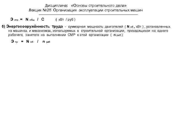 Дисциплина: «Основы строительного дела» Лекция № 28 Организация эксплуатации строительных машин Э стр = N общ / С ( к. Вт / руб ) 6) Энерговооружённость труда - суммарная мощность двигателей ( N об , к. Вт ) , установленных на машинах и механизмах, используемых в строительной организации, приходящихся на одного рабочего, занятого на выполнении СМР в этой организации ( n раб ) Э тр = N об / n раб