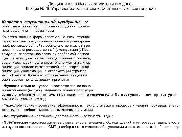 Дисциплина: «Основы строительного дела» Лекция № 29 Управление качеством строительно-монтажных работ Качество строительной продукции - соответствие качества построенных зданий проектным решениям и нормативам. Качество должно формироваться на всех стадиях строительства: предпроизводственной (проектирование), производственной (строительно-монтажный процесс) и послепроизводственной (эксплуатация). Поэтому оно является комплексной проблемой, зависящей от всех участников : государственных органов, заказчиков, проектных и строительно-монтажных организаций, заводов-изготовителей, транспортных организаций, участвующих в эксплуатации строительных объектов. Качество строительной продукции оценивается по следующим признакам : - Функциональные – уровень соответствия основному назначению (выпуску заданного объёма продукции высокого обеспечению оптимальных санитарно-гигиенических и бытовых условий, комфортных услокачества, вий жизни, отдыха и т. д. ) ; - Технологические – сочетание эффективности технологического процесса и уровня производительности труда с себестоимостью и качеством продукции ; - Конструктивные -прочность, долговечность, надёжность и др. ; - Эстетические – архитектурная выразительность внешнего облика зданий и интерьеров, тщательность и аккуратность выполнения СМР , подбор сантехнического оборудования и осветительных приборов и т. д.