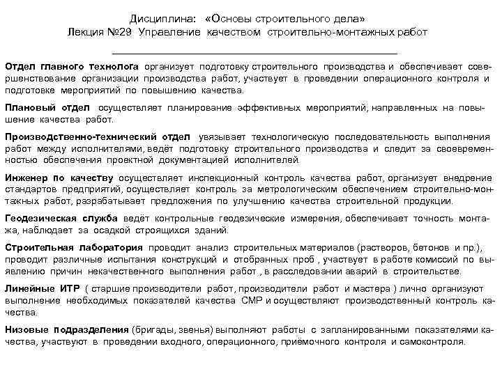 Дисциплина: «Основы строительного дела» Лекция № 29 Управление качеством строительно-монтажных работ Отдел главного технолога организует подготовку строительного производства и обеспечивает совершенствование организации производства работ, участвует в проведении операционного контроля и подготовке мероприятий по повышению качества. Плановый отдел осуществляет планирование эффективных мероприятий, направленных на повышение качества работ. Производственно-технический отдел увязывает технологическую последовательность выполнения работ между исполнителями, ведёт подготовку строительного производства и следит за своевременностью обеспечения проектной документацией исполнителей. Инженер по качеству осуществляет инспекционный контроль качества работ, организует внедрение стандартов предприятий, осуществляет контроль за метрологическим обеспечением строительно-монтажных работ, разрабатывает предложения по улучшению качества строительной продукции. Геодезическая служба ведёт контрольные геодезические измерения, обеспечивает точность монтажа, наблюдает за осадкой строящихся зданий. Строительная лаборатория проводит анализ строительных материалов (растворов, бетонов и пр. ), проводит различные испытания конструкций и отобранных проб , участвует в работе комиссий по выявлению причин некачественного выполнения работ , в расследовании аварий в строительстве. Линейные ИТР ( старшие производители работ, производители работ и мастера ) лично организуют выполнение необходимых показателей качества СМР и осуществляют производственный контроль качества. Низовые подразделения (бригады, звенья) выполняют работы с запланированными показателями качества, участвуют в проведении входного, операционного, приёмочного контроля и самоконтроля.