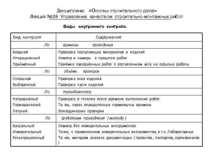 Дисциплина: «Основы строительного дела» Лекция № 29 Управление качеством строительно-монтажных работ Виды внутреннего контроля. Вид контроля Содержание По Входной Операционный Приёмочный проведения Проверка поступающих материалов и изделий Осмотр и замеры в процессе работ Приёмка завершённых работ с составлением акта на скрытые работы По Сплошной Выборочный объёму проверок Проверка всех изделий Проверка части изделий По Непрерывный Периодический Летучий периодичности Проверка в течение всего времени выполнения работ То же, через определённые промежутки времени Эпизодические проверки По Визуальный Измерительный Регистрационный времени средствам проведения ( методу ) Осмотр без измерительных инструментов То же, с применением измерительных инструментов, в т. ч. Лабораторных То же, методом анализа документации ( проектов , паспортов, сертификатов )
