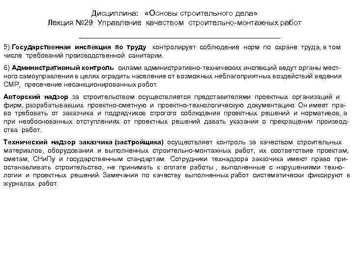 Дисциплина: «Основы строительного дела» Лекция № 29 Управление качеством строительно-монтажных работ 5) Государственная инспекция по труду контролирует соблюдение норм по охране труда, в том числе требований производственной санитарии. 6) Административный контроль силами административно-технических инспекций ведут органы местного самоуправления в целях оградить население от возможных неблагоприятных воздействий ведения СМР, пресечение несанкционированных работ. Авторский надзор за строительством осуществляется представителями проектных организаций и фирм, разрабатывавших проектно-сметную и проектно-технологическую документацию. Он имеет право требовать от заказчика и подрядчиков строгого соблюдения проектных решений и нормативов, а при необоснованных отступлениях от проектных решений давать указания о прекращении производства работ. Технический надзор заказчика (застройщика) осуществляет контроль за качеством строительных материалов, оборудования и выполненных строительно-монтажных работ, их соответствие проектам, сметам, СНи. Пу и государственным стандартам. Сотрудники технадзора заказчика имеют право приостанавливать строительство, не принимать к оплате работы , выполненные с нарушениями технологии и проектных решений. Замечания по качеству выполненных работ систематически фиксируют в журналах работ.