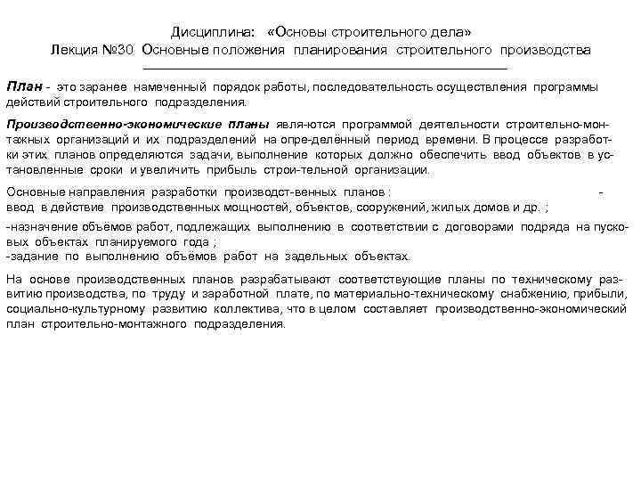 Дисциплина: «Основы строительного дела» Лекция № 30 Основные положения планирования строительного производства План - это заранее намеченный порядок работы, последовательность осуществления программы действий строительного подразделения. Производственно-экономические планы явля-ются программой деятельности строительно-монтажных организаций и их подразделений на опре-делённый период времени. В процессе разработки этих планов определяются задачи, выполнение которых должно обеспечить ввод объектов в установленные сроки и увеличить прибыль строи-тельной организации. Основные направления разработки производст-венных планов : ввод в действие производственных мощностей, объектов, сооружений, жилых домов и др. ; - -назначение объёмов работ, подлежащих выполнению в соответствии с договорами подряда на пусковых объектах планируемого года ; -задание по выполнению объёмов работ на задельных объектах. На основе производственных планов разрабатывают соответствующие планы по техническому развитию производства, по труду и заработной плате, по материально-техническому снабжению, прибыли, социально-культурному развитию коллектива, что в целом составляет производственно-экономический план строительно-монтажного подразделения.