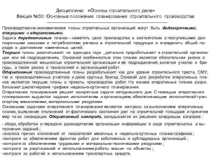 Дисциплина: «Основы строительного дела» Лекция № 30 Основные положения планирования строительного производства Производственно-экономические планы строительных организаций могут быть долгосрочными, текущими и оперативными. Задача перспективных планов – наметить цели производства в соответствии с поступившими долгосрочными заказами и потребностями региона в строительной продукции и определить общий порядок в достижении намеченных целей. Текущие планы рассчитывают на один-два года , детально прорабатывают в строительной организации или её подразделениях. Основной особенностью этих планов является обязательная увязка с производственной мощностью строительной организации и её подразделений, включая участки и бригады, а также увязка с технологией и организацией работ. Оперативные производственные планы разрабатывают как для уровня строительного треста, СМУ, так и производственных участков и даже крупных бригад. Основой для разработки оперативных планов являются текущие планы и проекты производства работ. На основе оперативных планов разрабатывают диспетчерские графики недельно-суточного планирования. Оперативное планирование решает конкретные задачи сегодняшнего дня. С помощью оперативного планирования выдаются задания исполнителям и организациям, обеспечивающим исполнителей транспортом, механизмами, материальными ресурсами. Основными задачами оперативного планирования являются контроль за выполнением оперативных планов, выявление отклонений от фактического состояния дел на строительной площадке и принятие мер по их ликвидации. Оперативный контроль складывается из решения следующих вопросов : - сбора, обработки и передачи руководителям организации информации о ходе строительства и выполнения заданий ; -анализа причин отклонений от показателей месячных и недельно-суточных планов-графиков ; -контроля за обеспечением фронтов работ для собственных и субподрядных организаций ; -контроля за обеспечением трудовыми и материально-техническими ресурсами ; -контроля за расстановкой и использованием работы машин на объектах ; -контроля за работой и использованием транспортных средств.