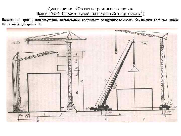 Дисциплина: «Основы строительного дела» Лекция № 24 Строительный генеральный план (часть 1) Башенные краны при отсутствии ограничений подбирают по грузоподъёмности Q , высоте подъёма крюка Hкр и вылету стрелы Lc