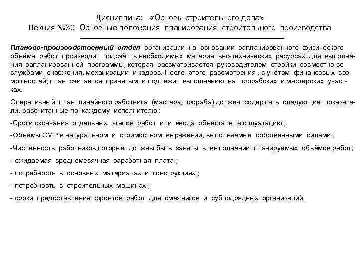 Дисциплина: «Основы строительного дела» Лекция № 30 Основные положения планирования строительного производства Планово-производственный отдел организации на основании запланированного физического объёма работ производит подсчёт в необходимых материально-технических ресурсах для выполнения запланированной программы, которая рассматривается руководителем стройки совместно со службами снабжения, механизации и кадров. После этого рассмотрения , с учётом финансовых возможностей, план считается принятым и подлежит выполнению на прорабских и мастерских участках. Оперативный план линейного работника (мастера, прораба) должен содержать следующие показатели, рассчитанные по каждому исполнителю : -Сроки окончания отдельных этапов работ или ввода объекта в эксплуатацию ; -Объёмы СМР в натуральном и стоимостном выражении, выполняемые собственными силами ; -Численность работников, которые должны быть заняты в выполнении планируемых объёмов работ; - ожидаемая среднемесячная заработная плата ; - потребность в основных материалах и конструкциях ; - потребность в строительных машинах ; - сроки предоставления фронтов работ для смежников и субподрядных организаций.