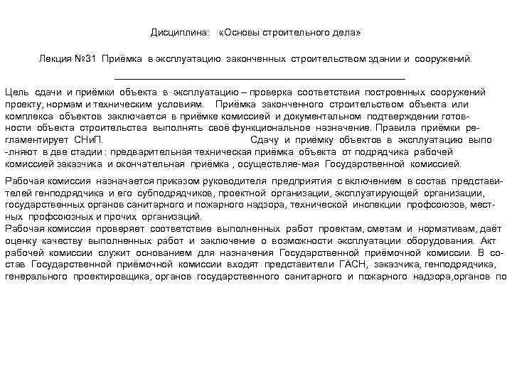 Дисциплина: «Основы строительного дела» Лекция № 31 Приёмка в эксплуатацию законченных строительством здании и сооружений. Цель сдачи и приёмки объекта в эксплуатацию – проверка соответствия построенных сооружений проекту, нормам и техническим условиям. Приёмка законченного строительством объекта или комплекса объектов заключается в приёмке комиссией и документальном подтверждении готовности объекта строительства выполнять своё функциональное назначение. Правила приёмки регламентирует СНи. П. Сдачу и приёмку объектов в эксплуатацию выпо -лняют в две стадии : предварительная техническая приёмка объекта от подрядчика рабочей комиссией заказчика и окончательная приёмка , осуществляе-мая Государственной комиссией. Рабочая комиссия назначается приказом руководителя предприятия с включением в состав представителей генподрядчика и его субподрядчиков, проектной организации, эксплуатирующей организации, государственных органов санитарного и пожарного надзора, технической инспекции профсоюзов, местных профсоюзных и прочих организаций. Рабочая комиссия проверяет соответствие выполненных работ проектам, сметам и нормативам, даёт оценку качеству выполненных работ и заключение о возможности эксплуатации оборудования. Акт рабочей комиссии служит основанием для назначения Государственной приёмочной комиссии. В состав Государственной приёмочной комиссии входят представители ГАСН, заказчика, генподрядчика, генерального проектировщика, органов государственного санитарного и пожарного надзора, органов по