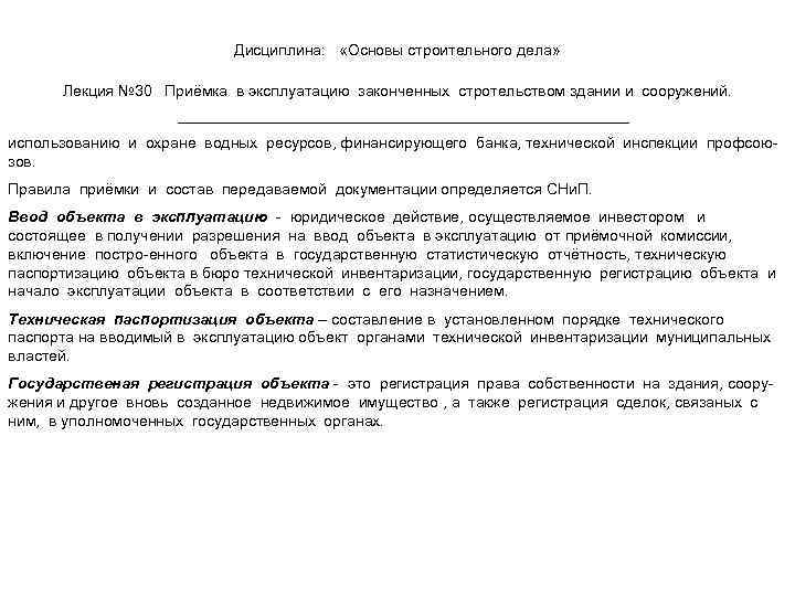 Дисциплина: «Основы строительного дела» Лекция № 30 Приёмка в эксплуатацию законченных стротельством здании и сооружений. использованию и охране водных ресурсов, финансирующего банка, технической инспекции профсоюзов. Правила приёмки и состав передаваемой документации определяется СНи. П. Ввод объекта в эксплуатацию - юридическое действие, осуществляемое инвестором и состоящее в получении разрешения на ввод объекта в эксплуатацию от приёмочной комиссии, включение постро-енного объекта в государственную статистическую отчётность, техническую паспортизацию объекта в бюро технической инвентаризации, государственную регистрацию объекта и начало эксплуатации объекта в соответствии с его назначением. Техническая паспортизация объекта – составление в установленном порядке технического паспорта на вводимый в эксплуатацию объект органами технической инвентаризации муниципальных властей. Государственая регистрация объекта - это регистрация права собственности на здания, сооружения и другое вновь созданное недвижимое имущество , а также регистрация сделок, связаных с ним, в уполномоченных государственных органах.