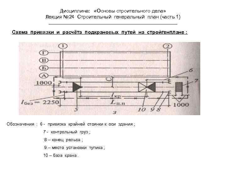 Дисциплина: «Основы строительного дела» Лекция № 24 Строительный генеральный план (часть 1) Схема привязки и расчёта подкрановых путей на стройгенплане : Обозначения : 6 - привязка крайней стоянки к оси здания ; 7 - контрольный груз ; 8 – конец рельса ; 9 – место установки тупика ; 10 – база крана.